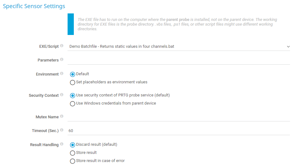 • Use security context of PRTG probe service (default): Run the file under the same Windows user account that the probe system runs under. By default, this is the Windows system user account.