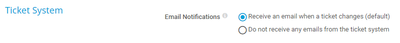 • Receive an email when a ticket changes (default): The user receives an email each time a ticket is assigned to the user or to the user group they are a member of, or if a ticket is changed.