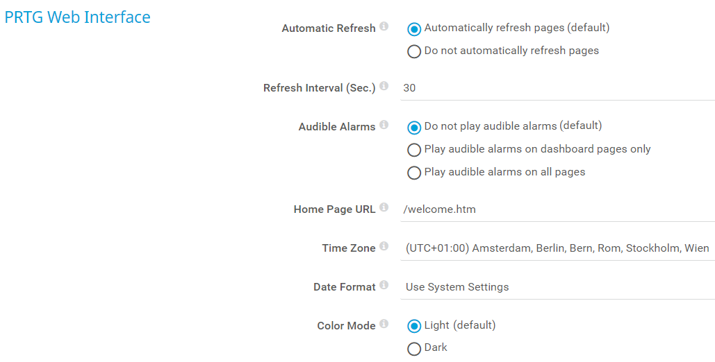 • Automatically refresh pages (default): PRTG automatically refreshes single page elements on web pages in the PRTG web interface.