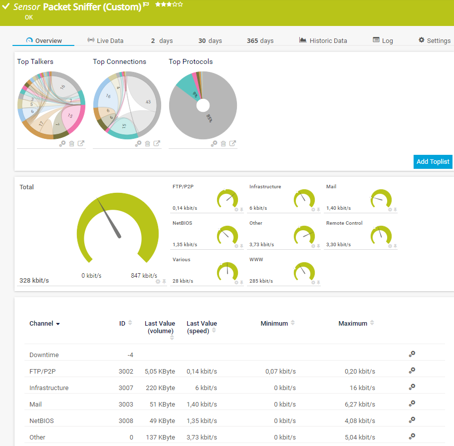 The Packet Sniffer (Custom) sensor monitors the headers of data packets that pass a local network adapter using a built-in packet sniffer. With this sensor, you can define your own channel definitions to divide traffic into different channels.